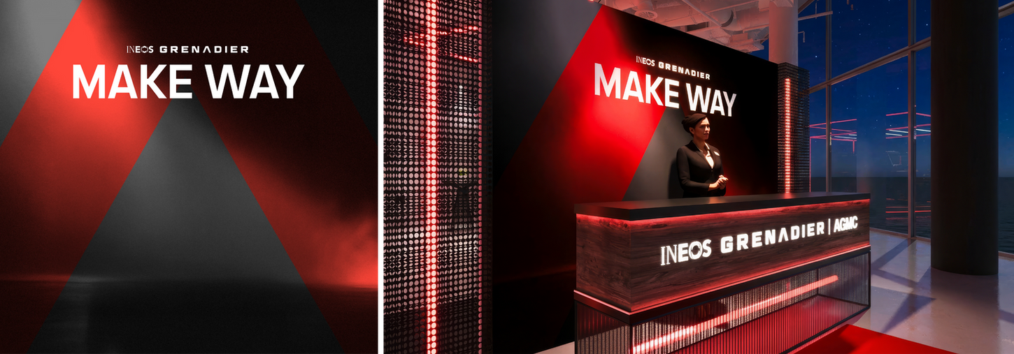 For the launch of the INEOS Grenadier in the UAE, the goal was to introduce the brand through a bold, credible pop-up experience. We positioned the Grenadier as an underdog in a region dominated by established 4×4s, allowing strength and capability to be revealed rather than announced. Using the existing brand as our foundation, we expanded its visual language into a mini showroom at Dubai Design District, Using shadow and smoke to suggest a quiet challenger, and bold orange striped forms to express power, confidence, and intent. Worked on it with The Hanging House